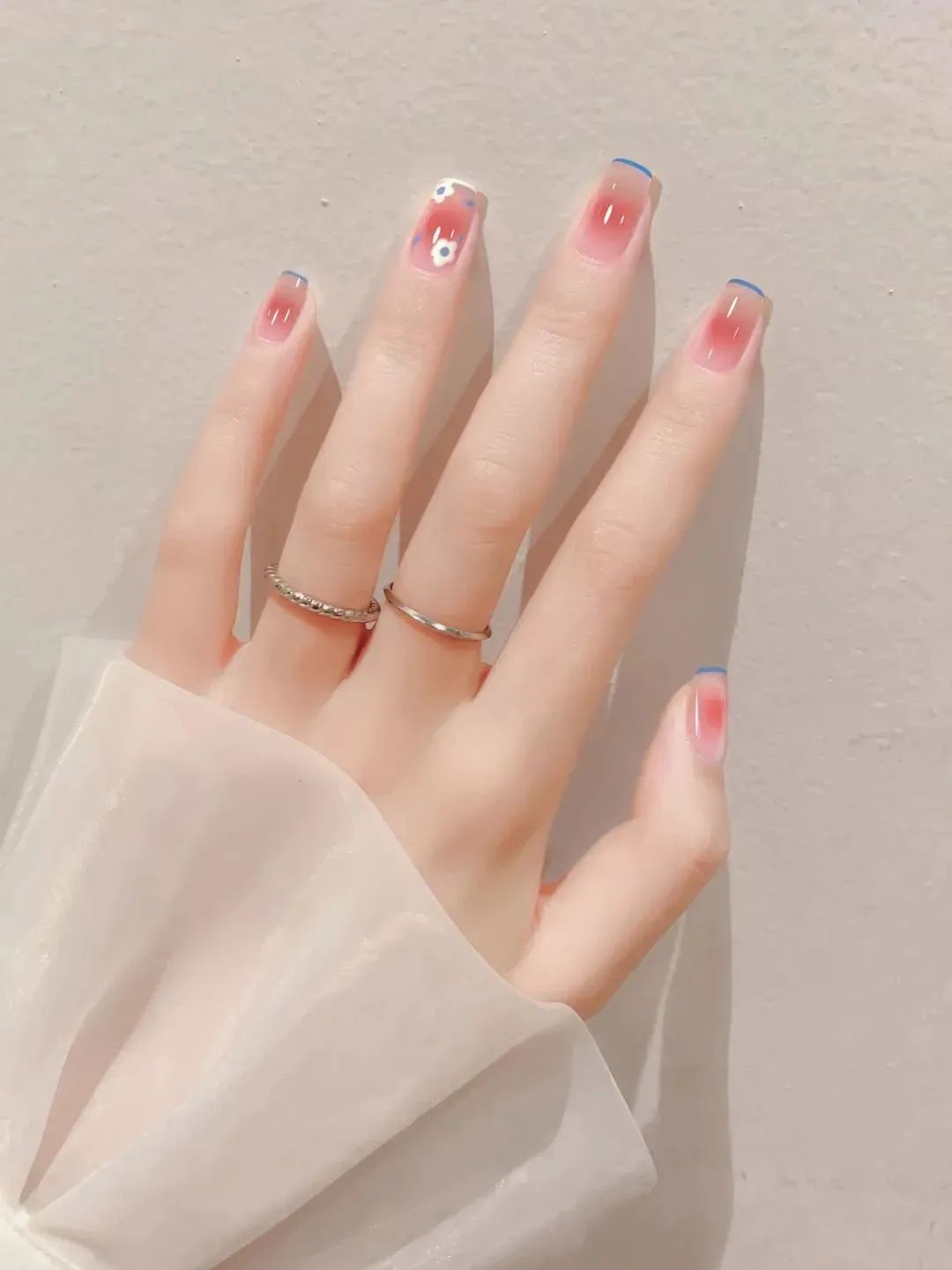 粉白搭配已经足够温柔了再在两只无名指上画上两朵白色的小花搭配蓝色简约线条,光看手就已经感受到满满的仙女氛围感了!