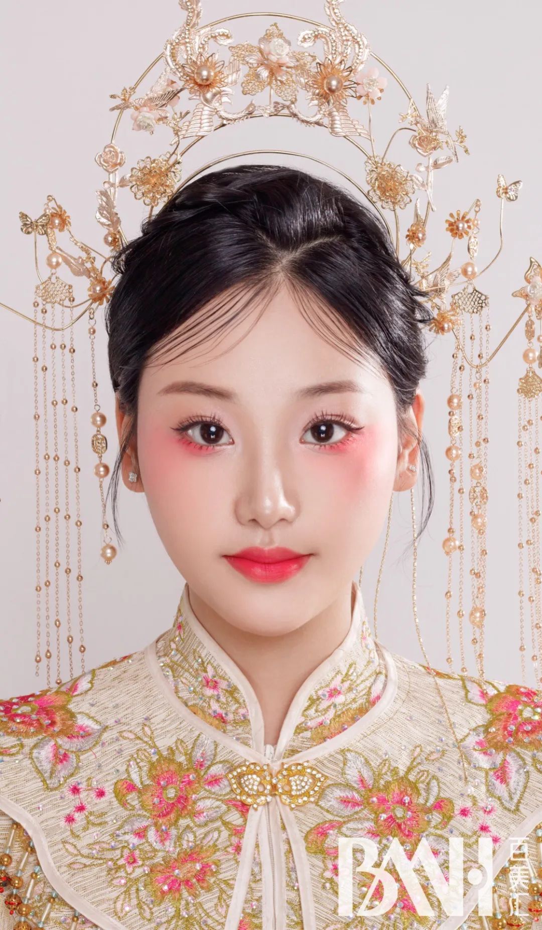 粉嫩的妆容突出新娘的柔美,对襟立领,凤冠霞帔,端庄秀丽,高贵典雅。