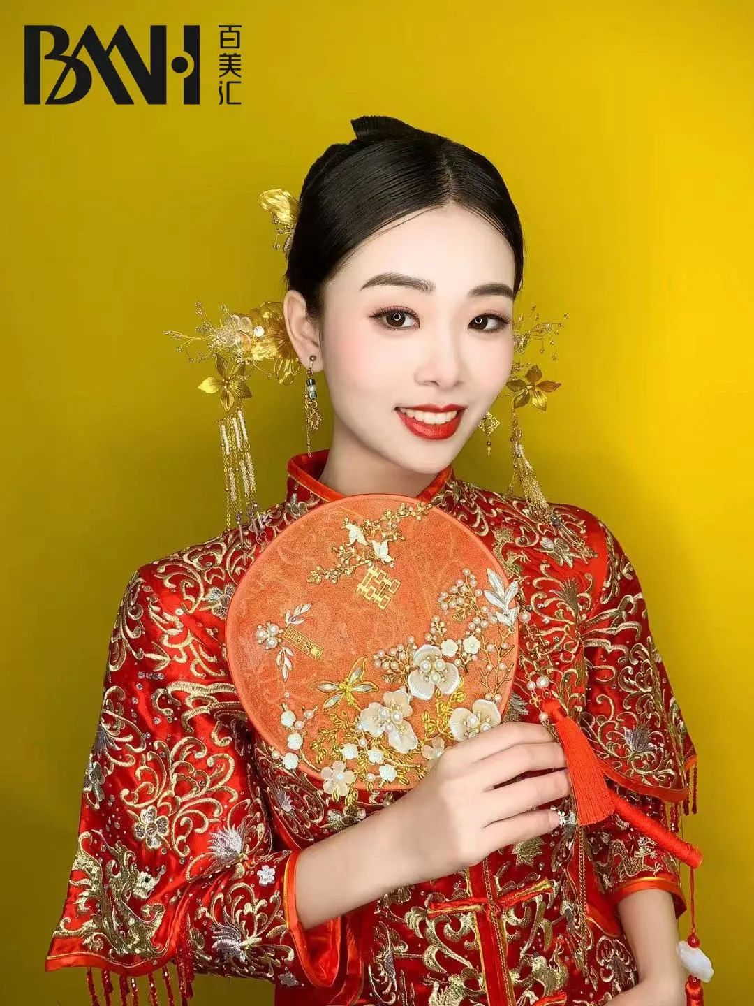 腮红&唇妆:腮红色调偏暖色,可以选用桔红色、棕红色。唇妆可以处理成喜庆的红唇,让一抹惊艳的正红唇色点亮新娘的蜜意柔情。
