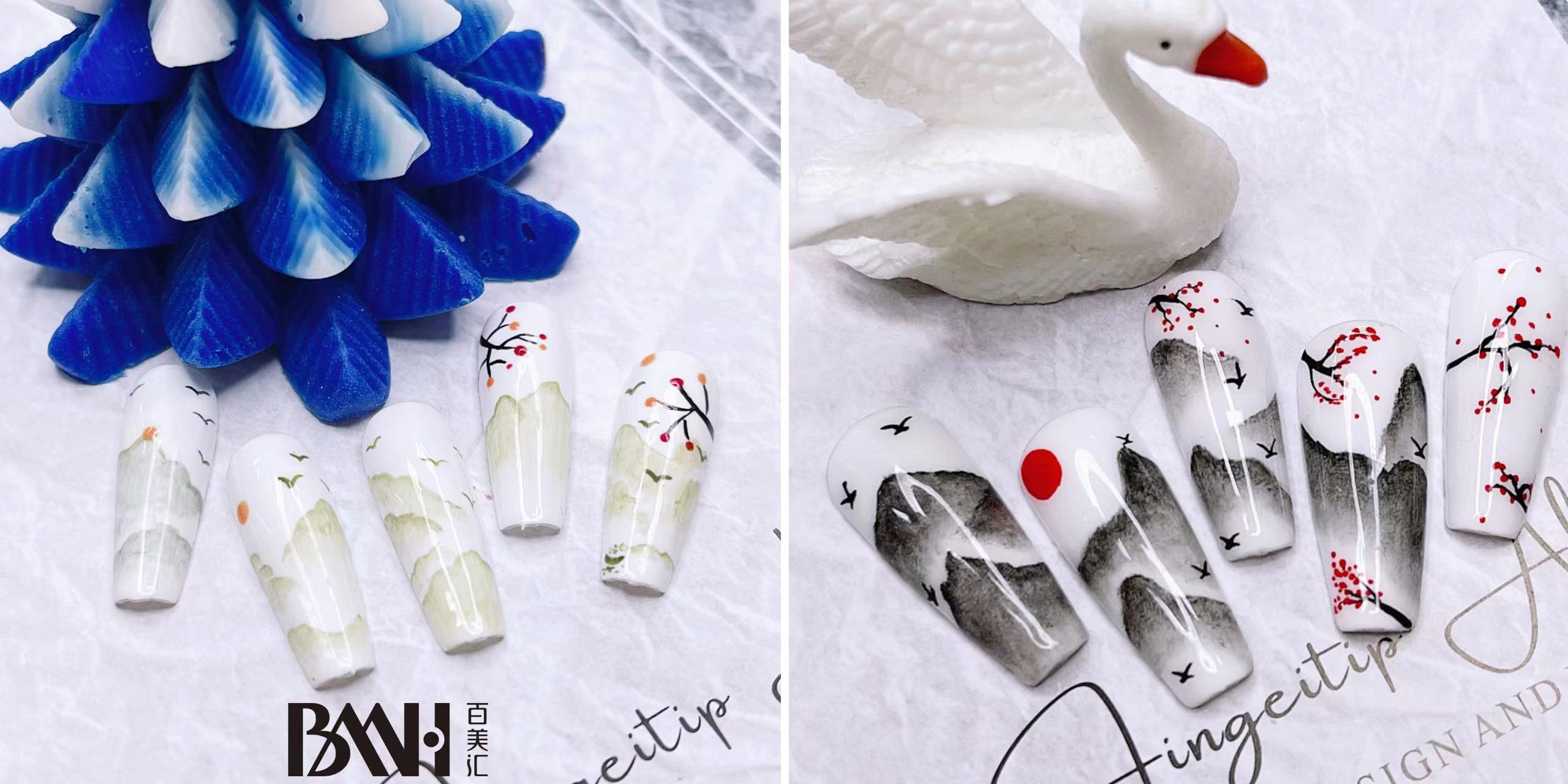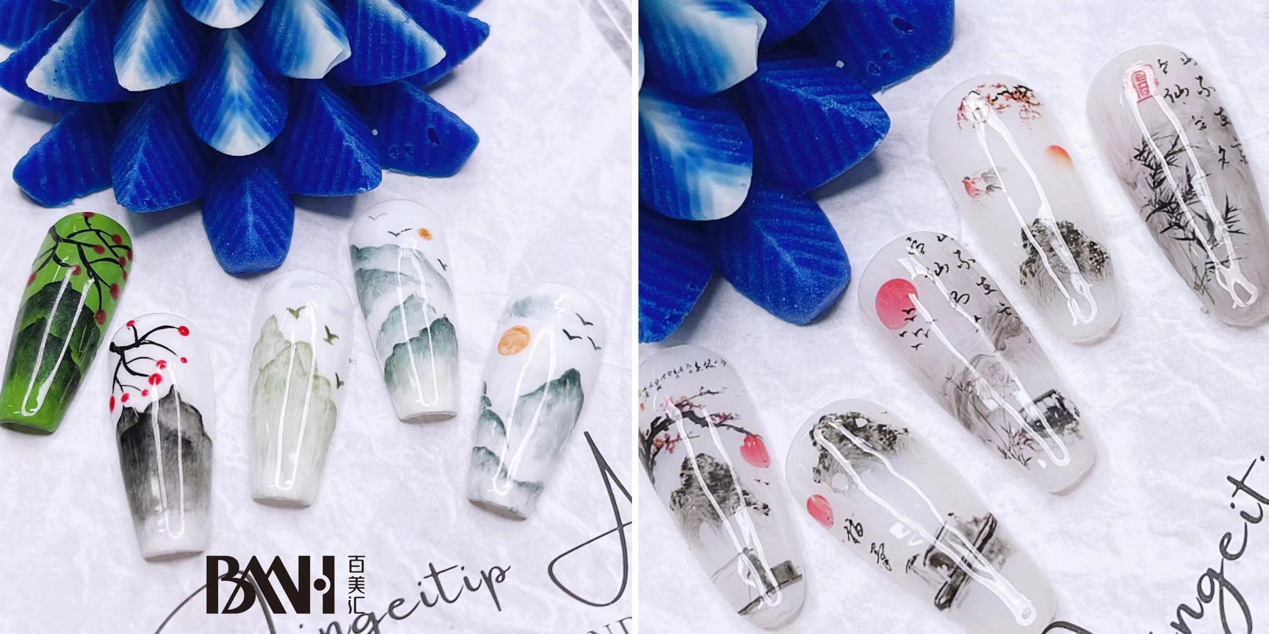 一幅水墨画卷在指尖展开。国画风美甲蕴含着一种低调之美,古色古香,日常上手也是很美的选择,凸显文雅气质。