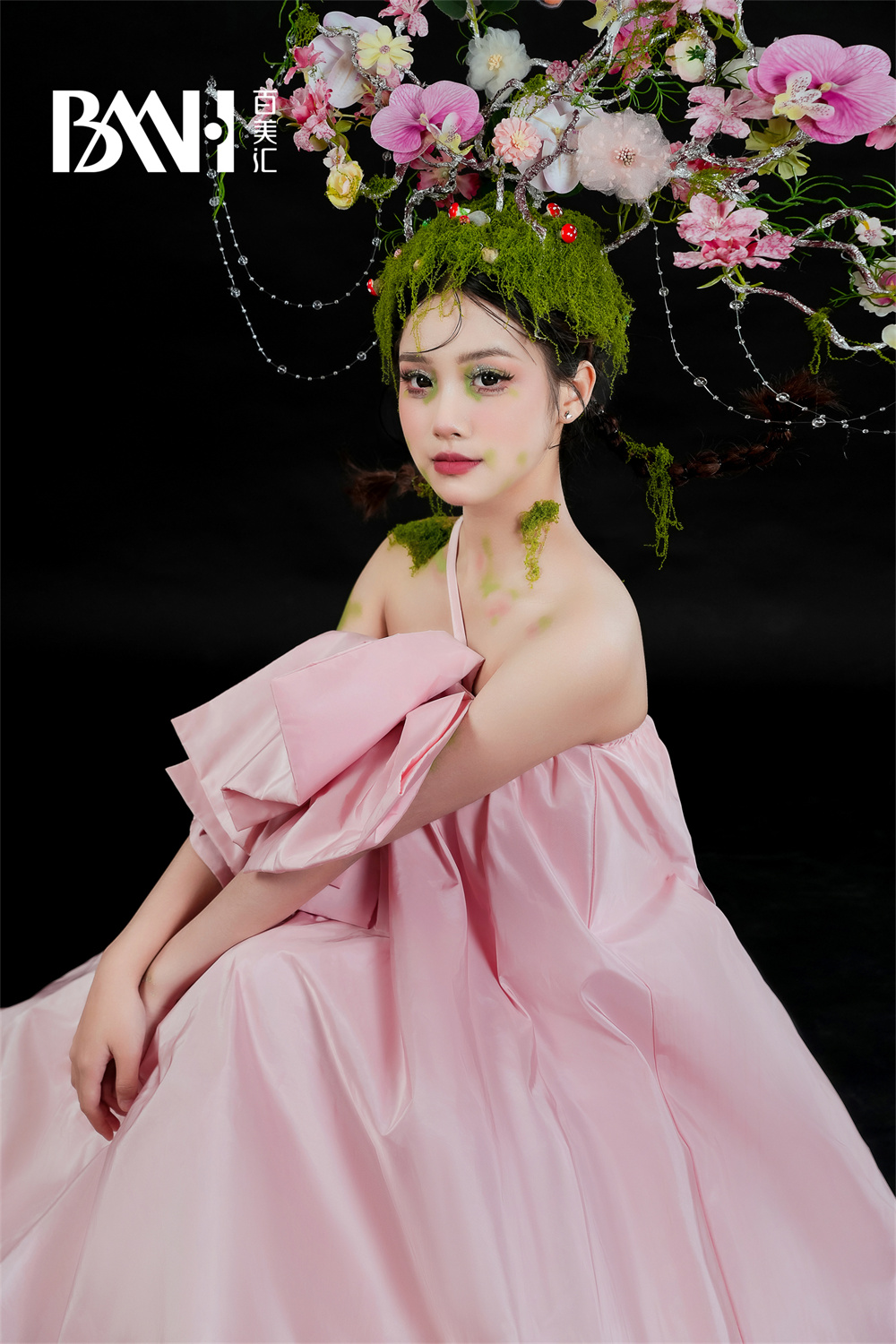 不仅在妆容中可以使用鲜花造型,头发造型也可以融入花卉的元素。在辫子或发髻中加入一朵花朵,或是将小花串成花环戴在头上,都能为整个造型增添一丝浪漫和唯美。在选取花朵的过程中,可以根据发色和脸型进行搭配,使头发和花朵相得益彰,呈现出最佳的效果。