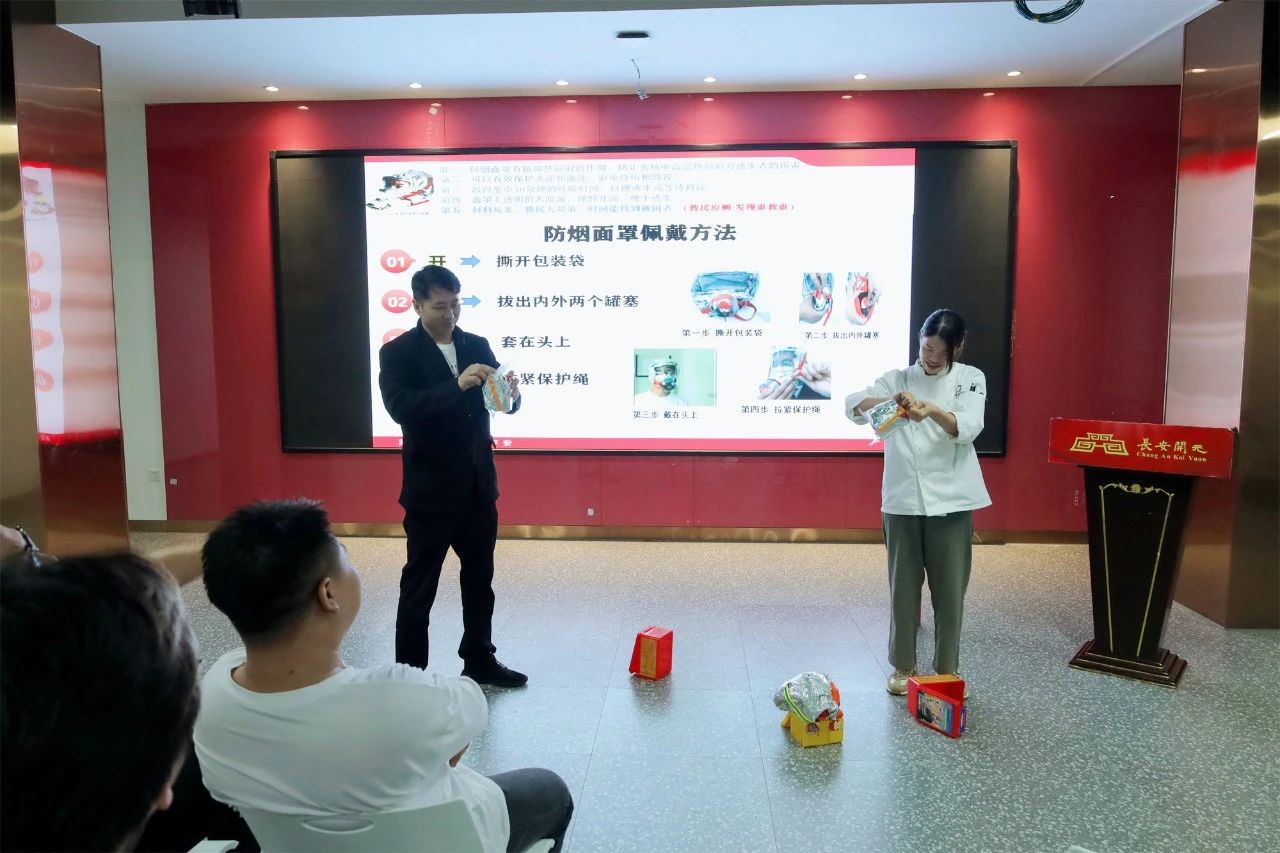 接下来,李老师介绍不同的火灾情景中,如何正确使用灭火工具以及如何应对。随后,李老师示范了如何使用灭火器以及防护面罩,并介绍了火场逃生的方法。