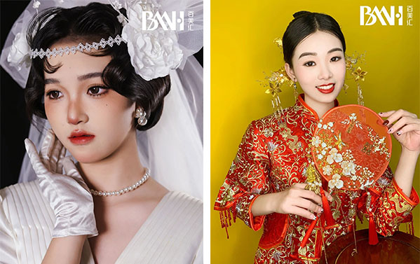 升班秀化妆造型采用新娘妆造主题,从妆容发型到礼服,从配饰到配色,每一个的搭配都是由学员自己亲自准备和创作。