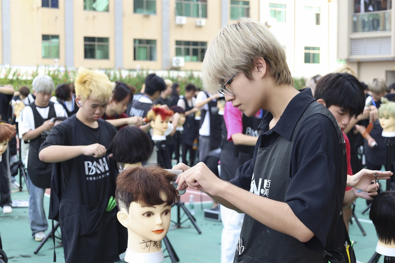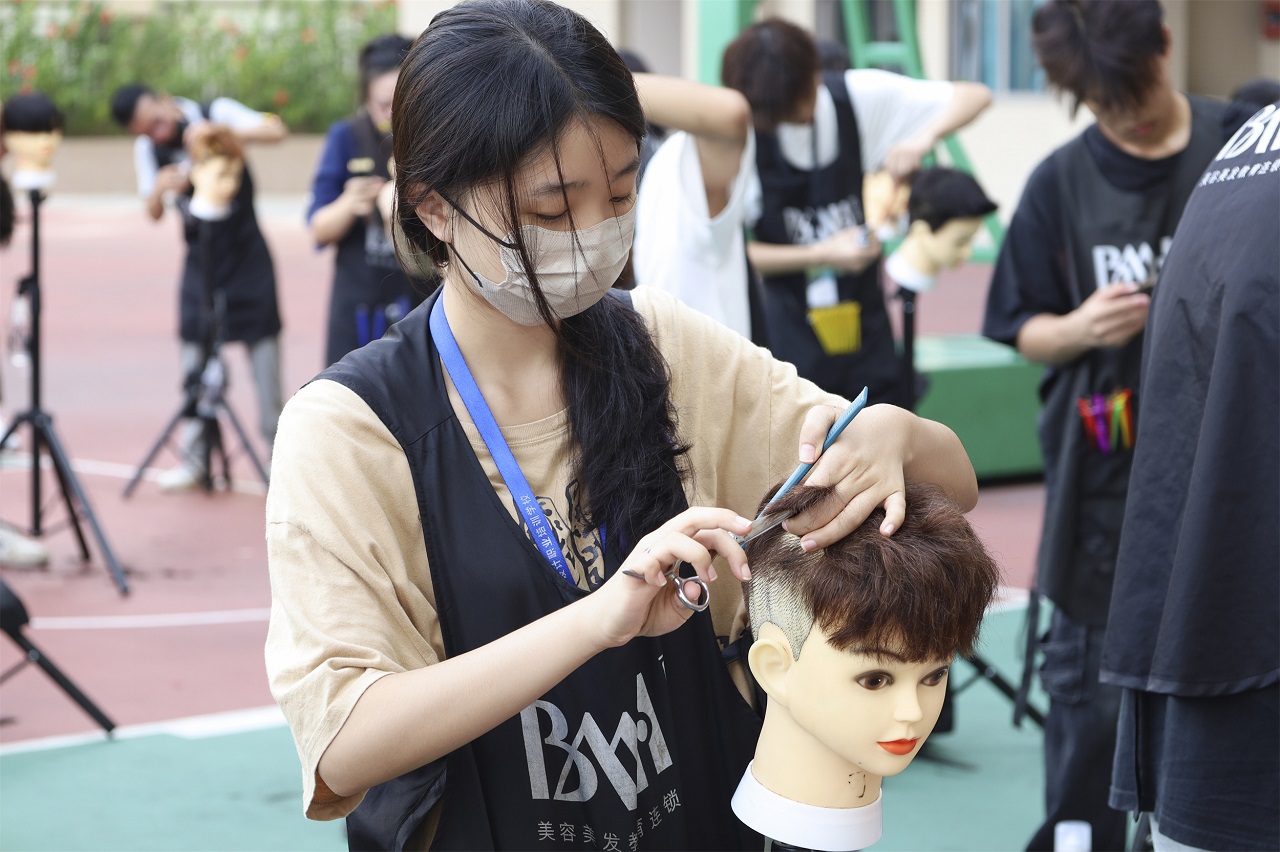 比赛中,同学们神情专注,纷纷发挥自己的创造力,飞舞手中的剪刀,一步一步将发型修剪出来。