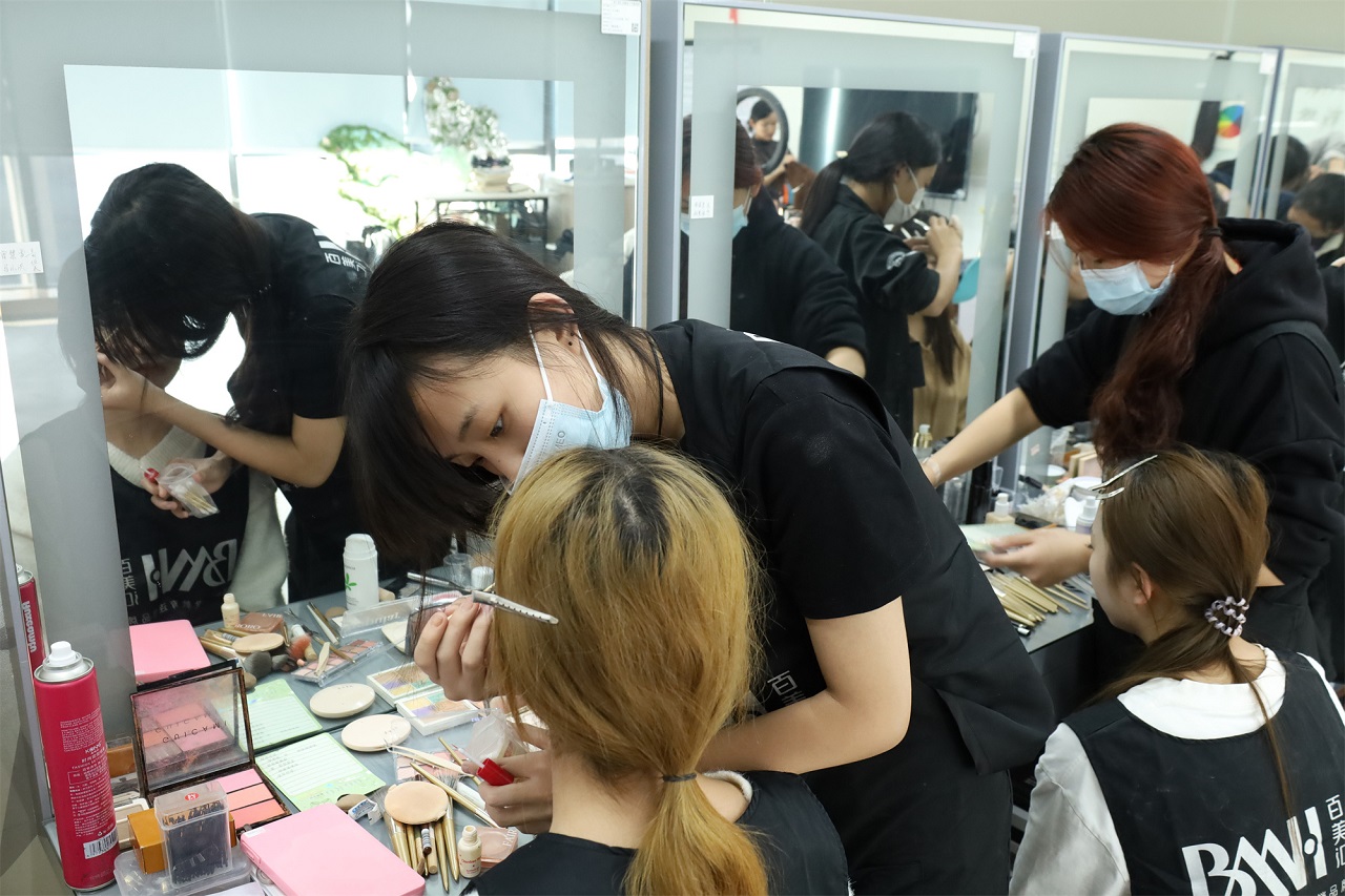 在彩妆实训区,学子们执笔绘就精彩,每一笔都彰显了学子们对细节的极致追求与对美的无限向往。