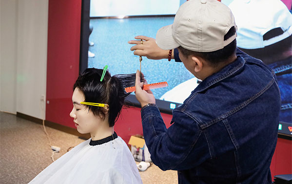公开课上,美发专业李振华老师先介绍了日系裁剪的发展与优势,让学员们对日系裁剪有了初步的认识。随后,进入peek-a-boo裁剪技术的讲解与示范环节,分享发片的提拉角度、切口的形状、去角的位置等具体操作技巧,老师展示了精湛的技术和娴熟的手法,打造出令人称赞的作品。