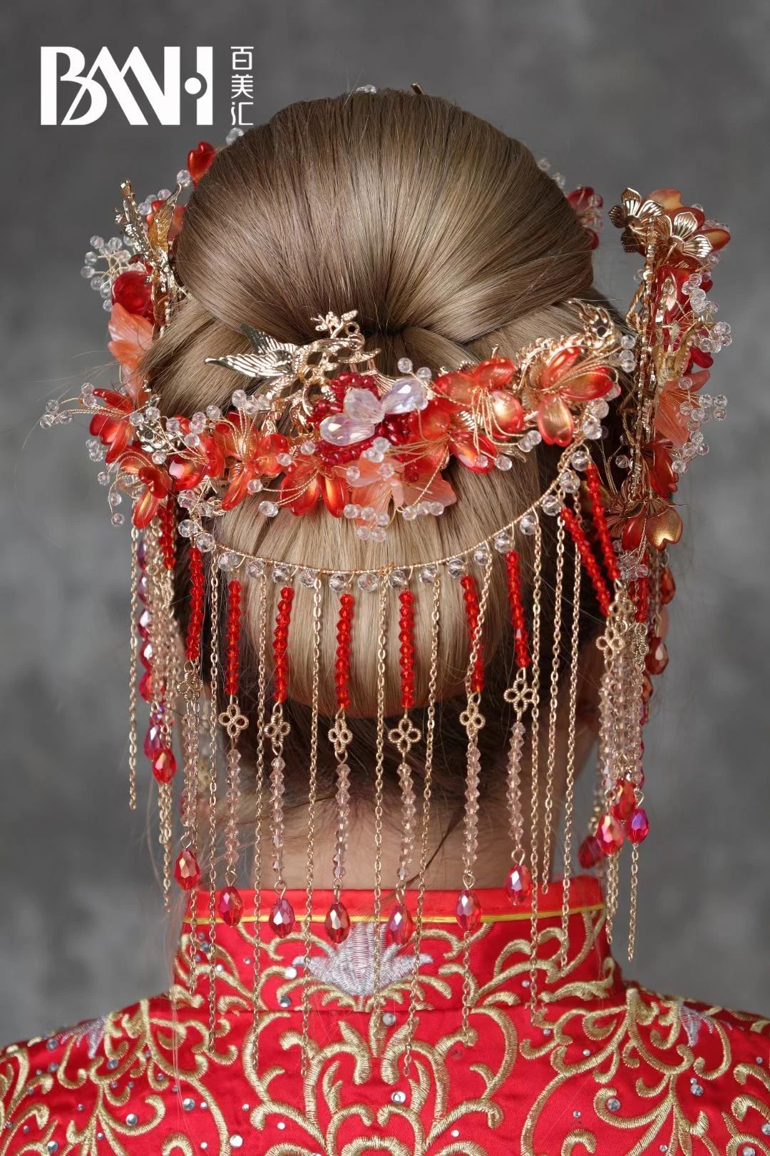 除了要有好的妆容,发型的设计与打造也非常重要,在发型方面,因为秀禾服的领子很高,如果把头发散下来的话会显得头很大,上半身很臃肿,为了避免这种问题,把头发盘起来,高盘发或者低盘发看新娘适合哪一种。
